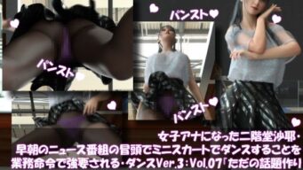 同人 【d_703357】女子アナになった二階堂沙耶・早朝のニュース番組の冒頭でミニスカートでダンスすることを業務命令で強要される・ダンスVer.3:Vol.07『ただの話題作りとのことで電源OFF(のはず)のカメラが4台、ローアングルから彼女のスカート内を覗き込むように設置されている:PV07_パンスト+ピンク色Tバックパンティで扇風機風チラ』【Libido-Labo】